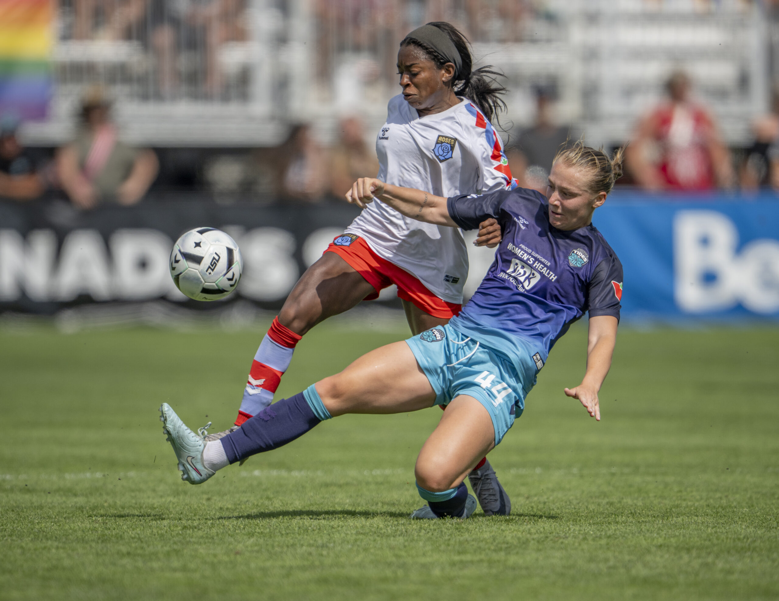 A contested 50–50 ball unfolds as the Halifax Tides and Montreal Roses collide in midfield. With both players fully committed and the ball suspended between…